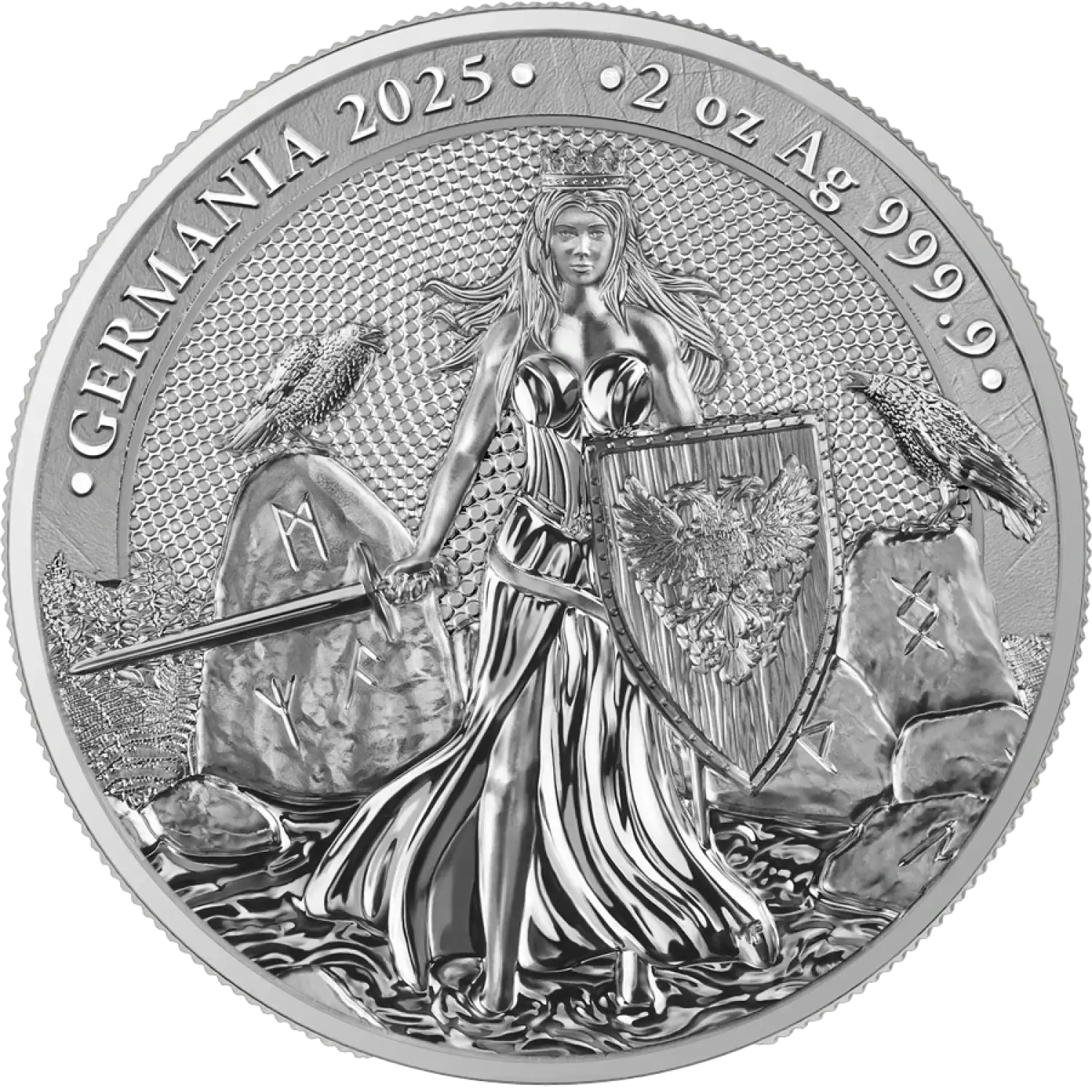 The 2025 2 oz Germania Silver Coin is a remarkable addition to any precious metals collection or investment portfolio. Known for its exquisite design and quality craftsmanship, this coin not only appeals to collectors but also serves as a secure store of value. Minted by the Germania Mint, this coin embodies the rich heritage and artistry of Germany, making it an exceptional choice for both seasoned investors and new collectors alike.